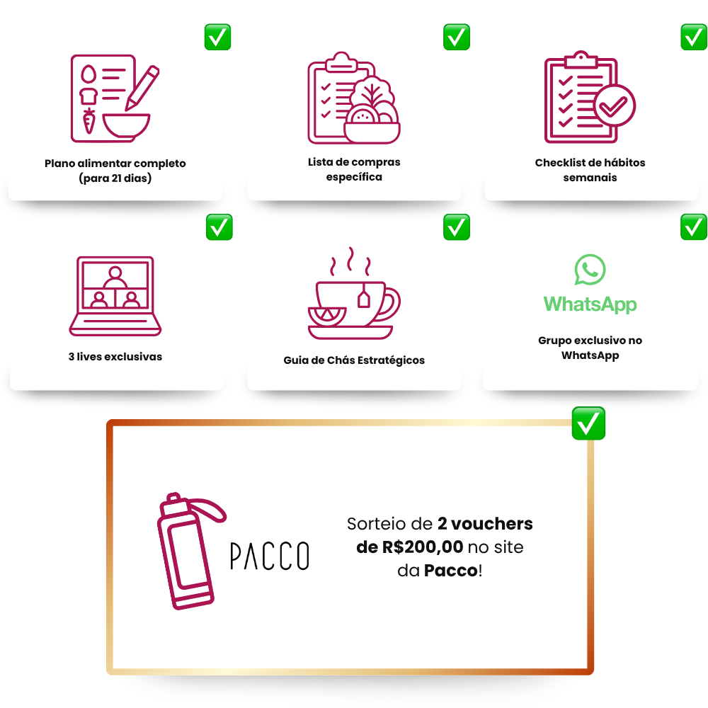 Você terá orientação da nutricionista responsável ao longo do desafio para tirar dúvidas, ajustar o caminho e não ficar perdida durante os 21 dias (todos os detalhes dos entregáveis e aulas serão enviados no WhatsApp após a compra).
