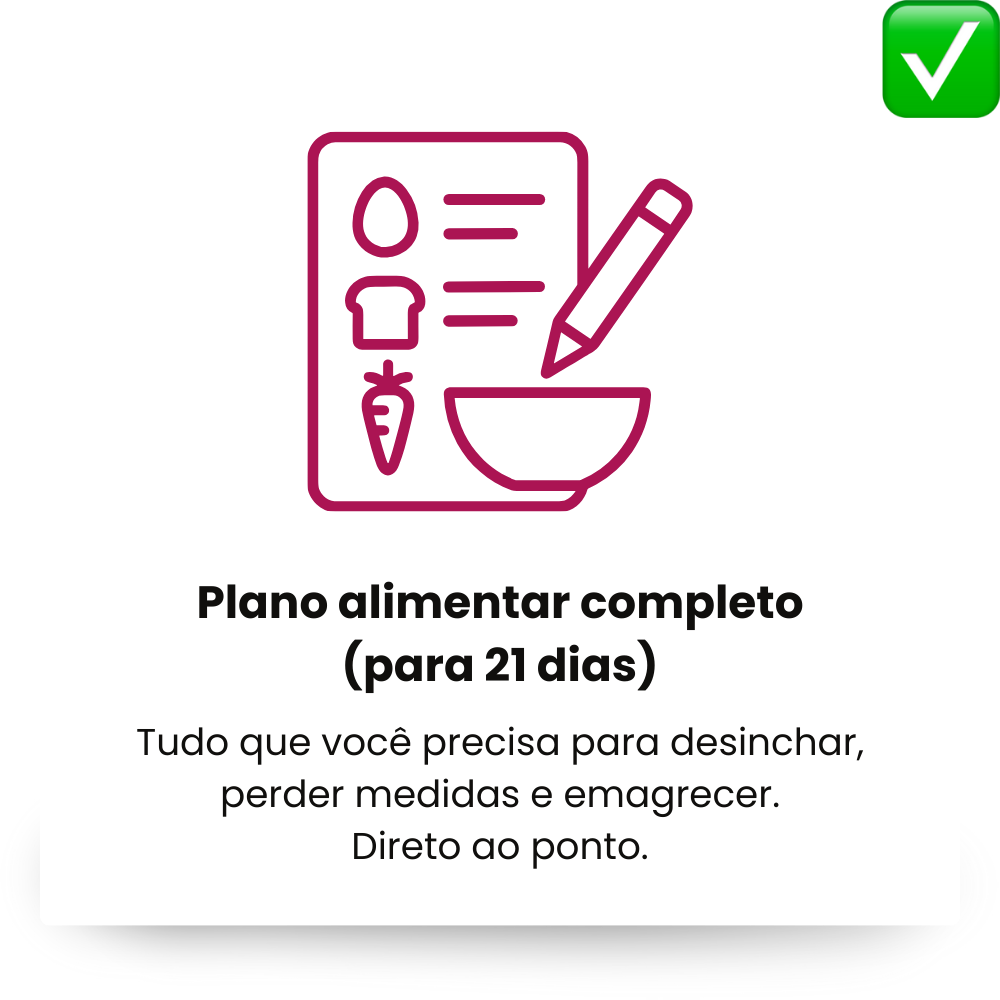 Para quem sente inchaço e retenção com frequência, quer emagrecer com constância, perde o controle com comida em momentos de ansiedade/cansaço, já tentou várias estratégias e quer um caminho simples, possível e acompanhado por 21 dias.